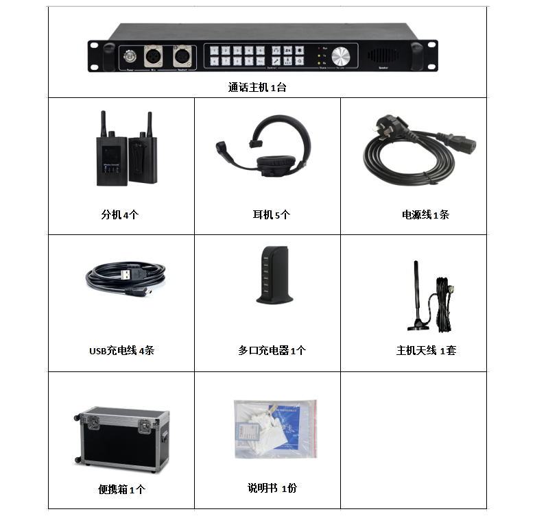 1.通話主機采用1U標準機架式設計,配備揚聲器、音量控制旋鈕、4Pin XLR頭戴耳機口、3Pin XLR麥克接口、DB 25Pin Tally輸入接口、ANT收發天線接口、AUX音頻輸入輸出和220V電源接口,主機可上機架安裝。