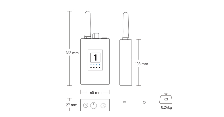 天線接口SMA-K母頭 開關及音量旋鈕 6芯mini XLR耳機接口 3.5寸LED顯示屏 狀態指示燈 分機設置按鍵 mini usb充電口 3.5 Tally輸出口 背夾 |